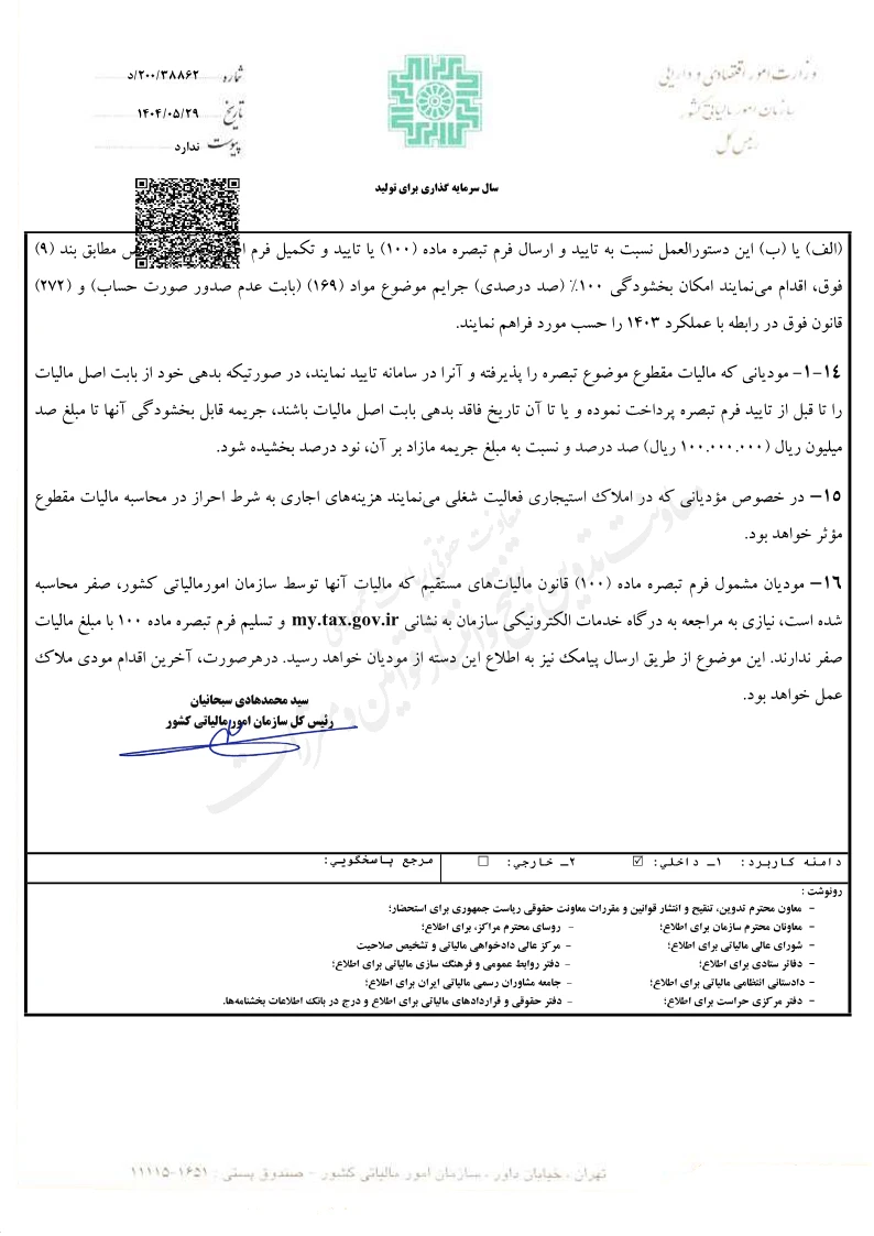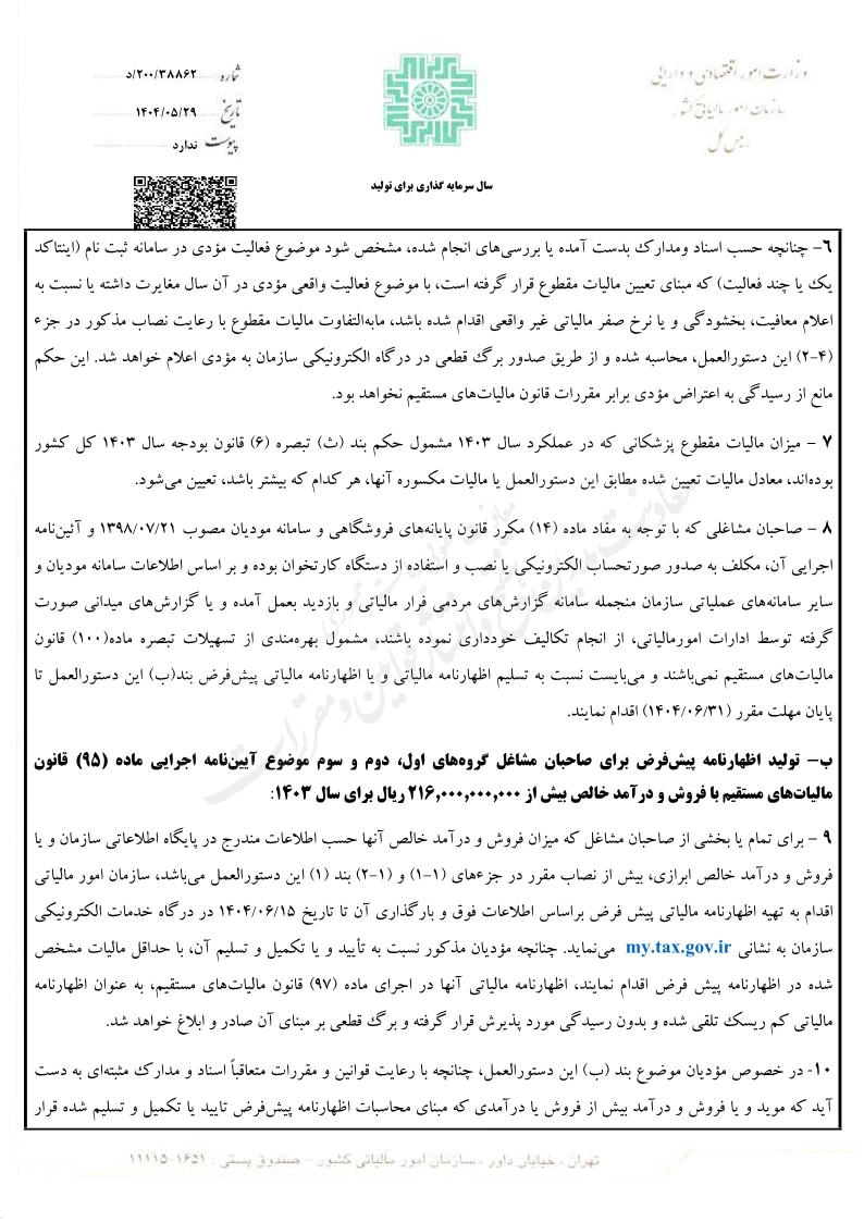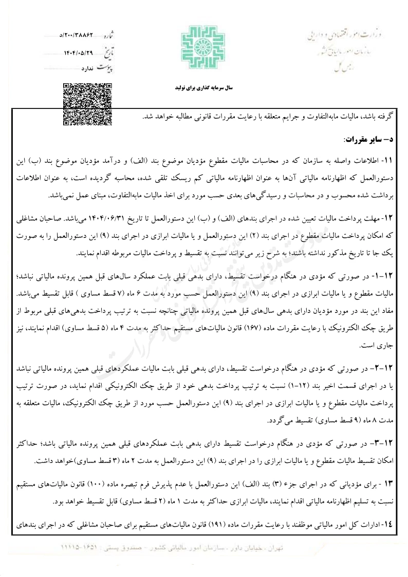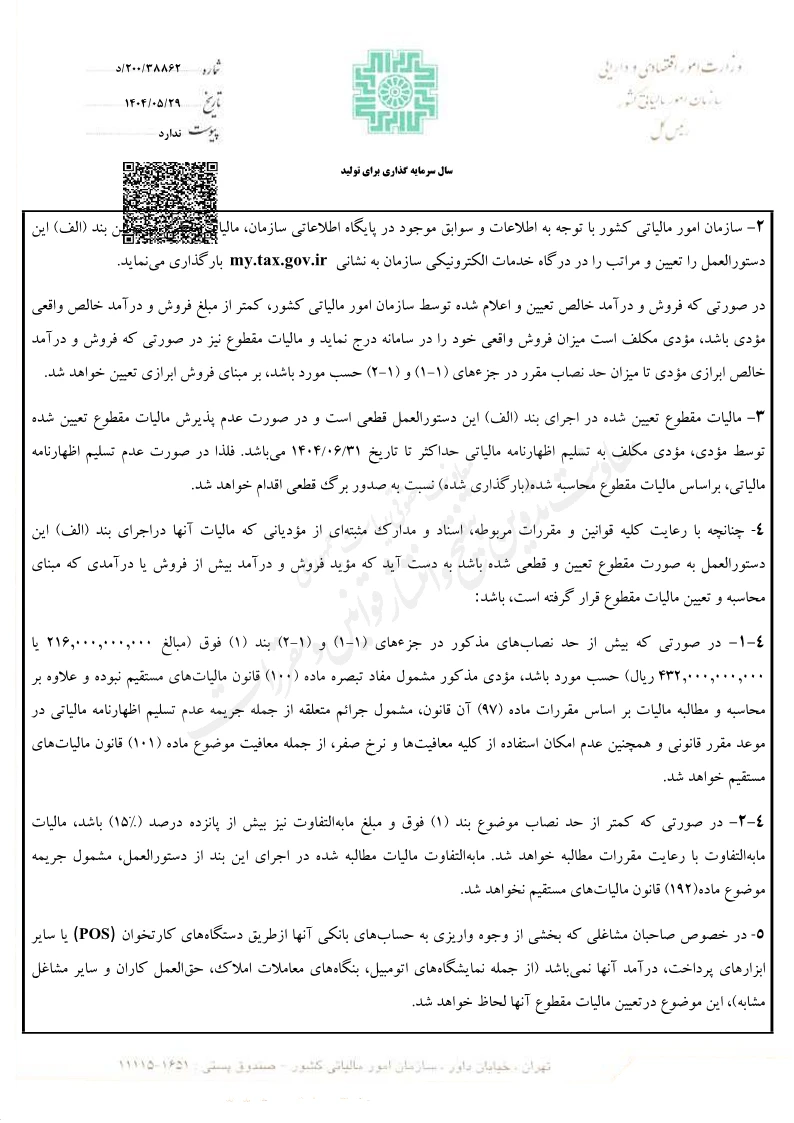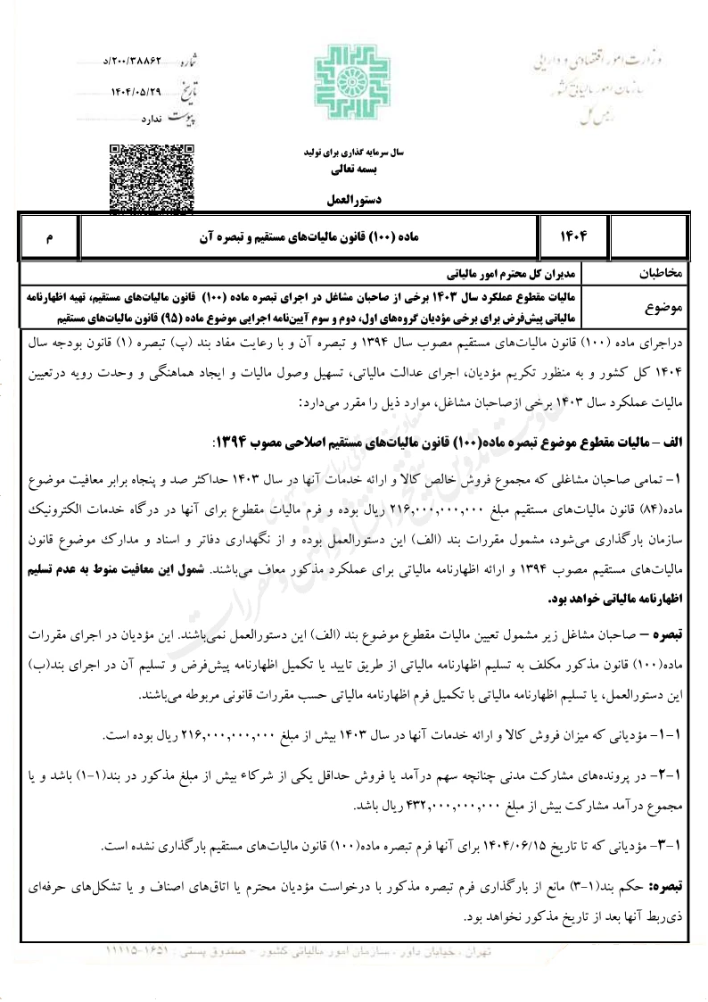 دستورالعمل تبصره ماده ۱۰۰ قانون مالیات های مستقیم برای مالیات مقطوع عملکرد سال ۱۴۰۳